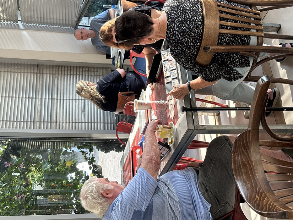 The image depicts an indoor dining or café setting in Kfar Saba, Israel, characterized by bright natural light entering through large windows with horizontal blinds. In the foreground, two elderly individuals are engaged in a game of Rummikub at a square-tiled table with a metal frame. On the left, an older man with white hair, wearing a light blue striped shirt and dark pants, is seated, with his hands positioned over game tiles on the table. To his right, an older woman with dark hair, wearing a black and white patterned top and light-colored pants, is seated, actively arranging tiles on her Rummikub rack. A black walking cane is visible leaning against the table near her chair. On their table, a glass with a clear beverage, ice, and a lemon wedge on a white saucer is present, along with a paper coffee cup, an empty metal tray, and a blue cloth. A "Rummikub" game box is also visible. In the mid-ground, at an adjacent table with red metal chairs, a woman with long blonde, curly hair is seated with her back to the camera, wearing a dark top and blue jeans. Next to her, a woman with reddish-brown hair, wearing sunglasses on her head, is also seated with her back to the camera. In the background, on the right side of the image, a bald man wearing a light blue short-sleeved shirt is seated at another table, looking towards the foreground. Plates and a glass bottle are visible on his table. Outside the windows, green foliage, including a tree with visible yellow fruit, suggests an outdoor area or street beyond. The overall scene indicates a casual social gathering.