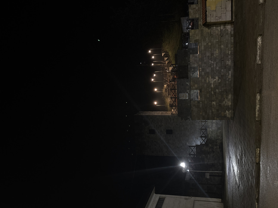 The image depicts an exterior nighttime scene in the city of Strazhitsa, Bulgaria. The foreground features a dark, paved surface, likely a road or parking area, with two light-colored curbs extending horizontally across the lower edge. The pavement exhibits reflective properties, suggesting a damp condition. In the mid-ground, a prominent, tall, rectangular stone tower constructed from dark, rough-hewn blocks is visible on the left, featuring two square, dark openings on its facade. To the right of the tower, and extending across the center, are dark stone fortified walls, some with crenellated top edges, and others surmounted by dark wooden railings that form pathways or viewing platforms. A tall streetlamp on a pole, positioned to the left of the stone tower, emits a strong white light, producing lens flare effects. Behind the lower stone structures, a grassy incline rises, upon which at least seven additional streetlights are mounted, ascending upwards. These lights emit a warm, yellow-orange glow. More dark wooden railings are integrated into the design on this elevated section. On the far right, the stone wall terminates near a small structure topped with a reddish-brown tiled roof. A portion of a light-colored building with a dark roofline is visible on the far left. The sky is dark and clear, with a faint greenish light anomaly present in the upper right quadrant. The scene is devoid of people, subjects, or active interactions.