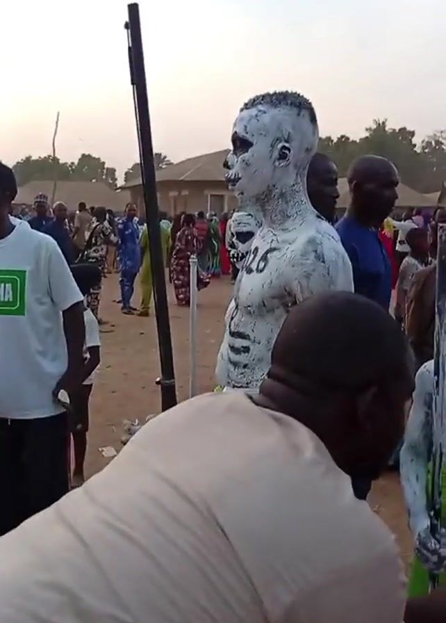 group of people gathered outdoors in a dusty area, possibly a field. Among them are two individuals painted entirely in white, with skull-like makeup on their faces. One is an adult and the other appears to be a child. The adult is shirtless with black markings on the torso, and the child is wearing a green cloth around their waist. Both are holding long, slender objects, possibly sticks or staffs. The crowd appears to be observing or interacting with these individuals. There are buildings and trees visible in the background, suggesting a village or town setting. The scene seems to depict a cultural performance or ritual.