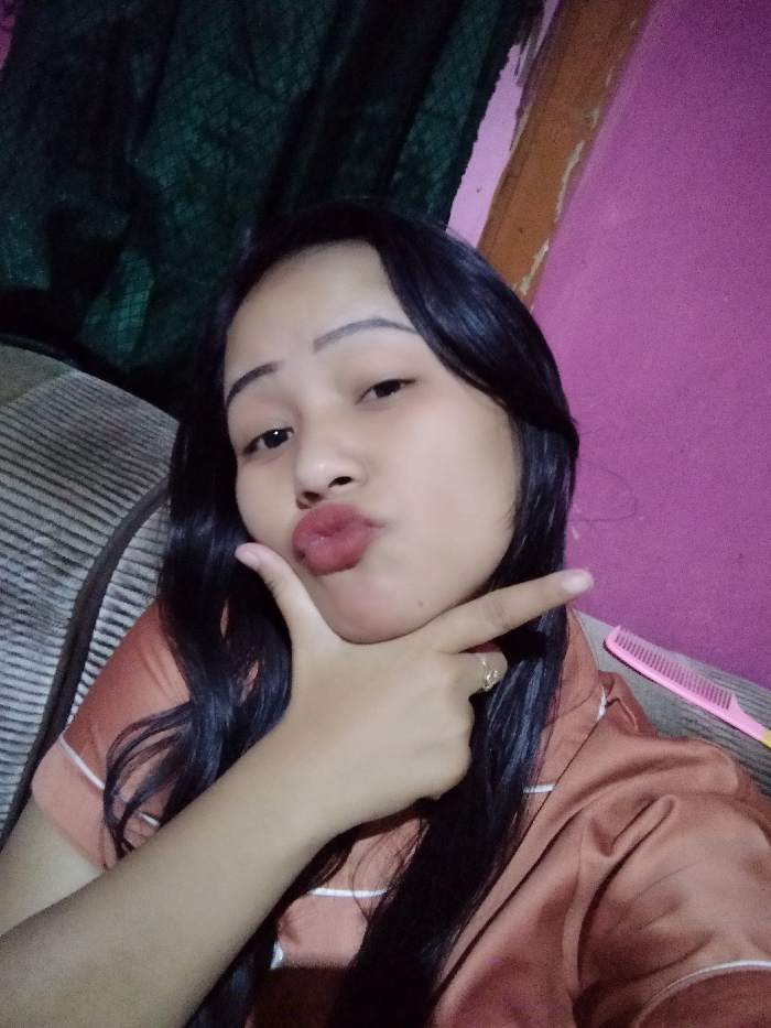 An indoor photograph captures a female individual, appearing young adult, posing for the camera. She has dark hair and is wearing a light brown or peach-colored, collared top with visible white piping. Her lips are pursed, and her right hand is raised to her chin, with her thumb and index finger extended outwards. A gold-toned ring is visible on her right ring finger. The background includes a dark green textured fabric or curtain on the upper left, a solid pink wall on the right, and a light-colored, vertically striped upholstered surface on the lower left. A pink plastic comb with a yellow handle tip is visible on the right side, resting on a surface behind the subject's right arm. The location is Unknown, Unknown.