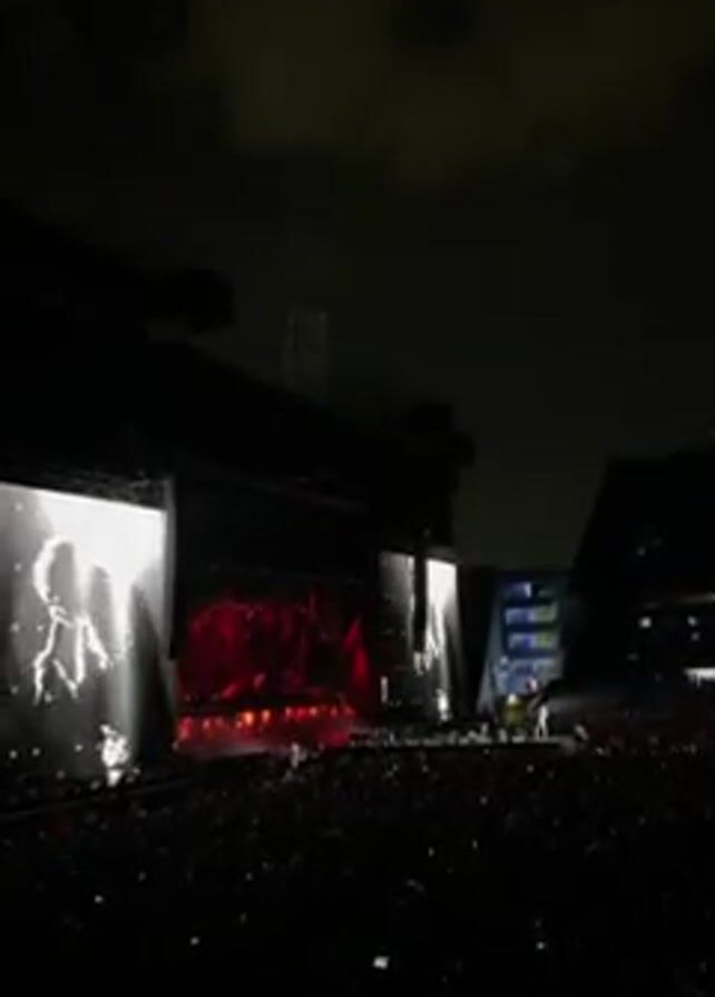 concert stage at night with a large crowd. Silhouettes of the artist are projected on screens on either side of the stage. Red lights illuminate the stage, and the crowd is visible in the dark. The sky is dark with clouds.