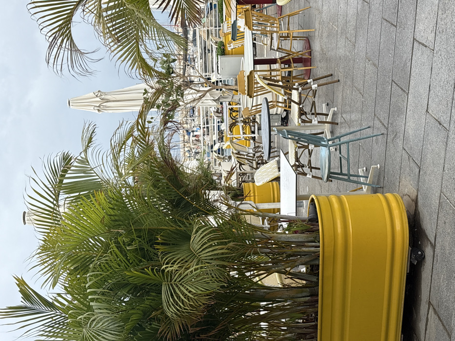 This image depicts an unoccupied outdoor cafe terrace situated at the Ashkelon Marina in Ashkelon, Israel, under an overcast sky