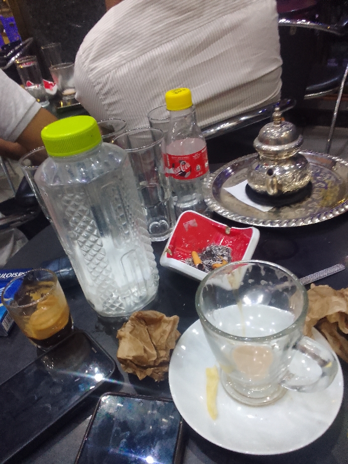 The image depicts a close-up view of a dark, reflective table surface within a cafe setting, likely located in Meknes, Morocco. The scene suggests a recently occupied space with multiple patrons. Prominently featured in the foreground is an empty clear glass mug with a handle, resting on a white saucer. The mug contains light brown residue from a consumed beverage, and a small, thin yellow strip, possibly a lemon peel, lies on the saucer. To the left, two dark-colored smartphones are positioned screen-up, reflecting ambient light. A short, clear glass containing residual dark brown liquid, consistent with coffee, is visible above the phones, next to a partially visible blue and white cigarette packet. A large, clear plastic bottle with a lime-green screw cap and a diamond-textured pattern is central to the image. To its right, a smaller, clear plastic bottle with a yellow screw cap and a red "Coca-Cola" brand label stands next to an empty clear glass tumbler. Further right, a red and white rectangular ashtray is present, filled with ash and several cigarette butts. In the upper right quadrant, an ornate silver-colored traditional Moroccan teapot (berrad) rests on a decorative silver-colored tray with an embossed pattern, positioned on a dark coaster. Portions of two individuals are visible in the background: one wearing a white, vertically striped garment and another in a white t-shirt, indicating seated patrons. Additional empty clear glass tumblers are scattered across the table. Crumpled brown paper is also visible on the table surface.