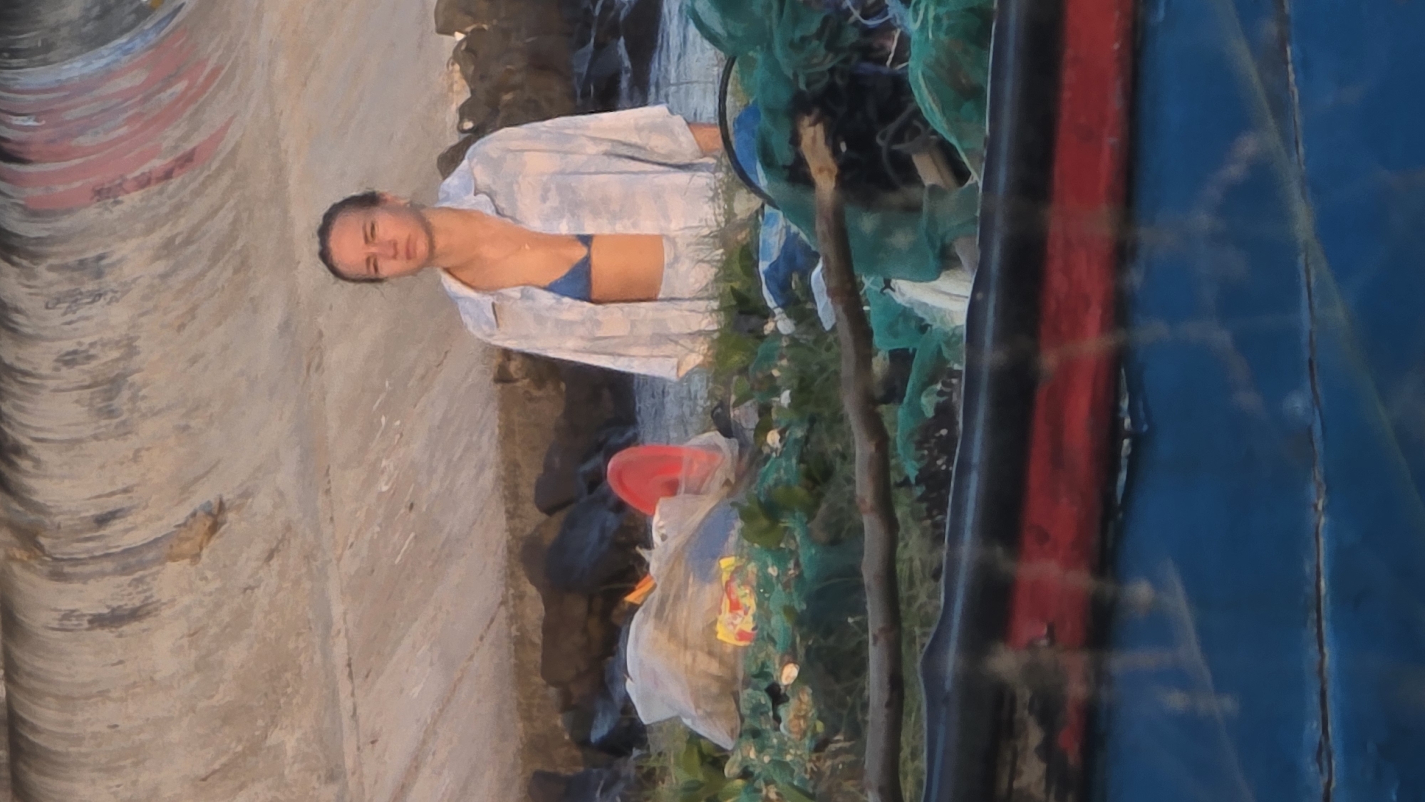 woman in a blue bikini top and a light blue shirt. She is standing near what appears to be a tunnel or concrete structure. There is a red bowl and some green netting and trash nearby. The location is Nha Trang, Vietnam.