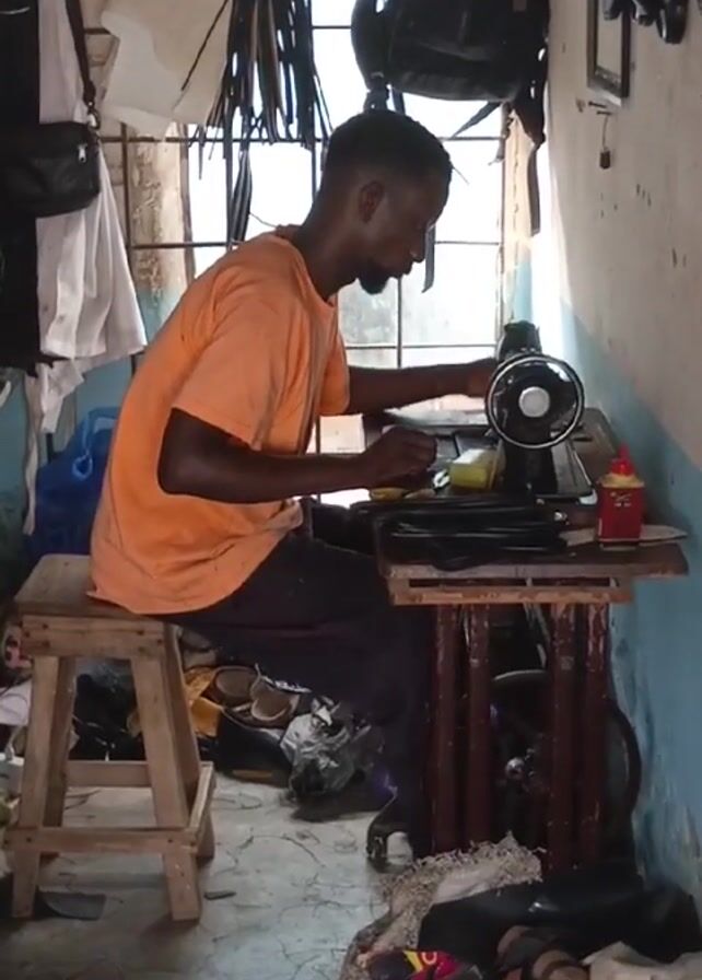 A man is sitting on a wooden stool at a sewing machine, working on a black piece of material. He is wearing an orange t-shirt and dark pants. The sewing machine is on a small wooden table. The room appears to be a workshop, with various items hanging on the walls and piled on the floor, including shoes, bags, and scraps of fabric. A window is visible in the background. The lighting is somewhat dim.