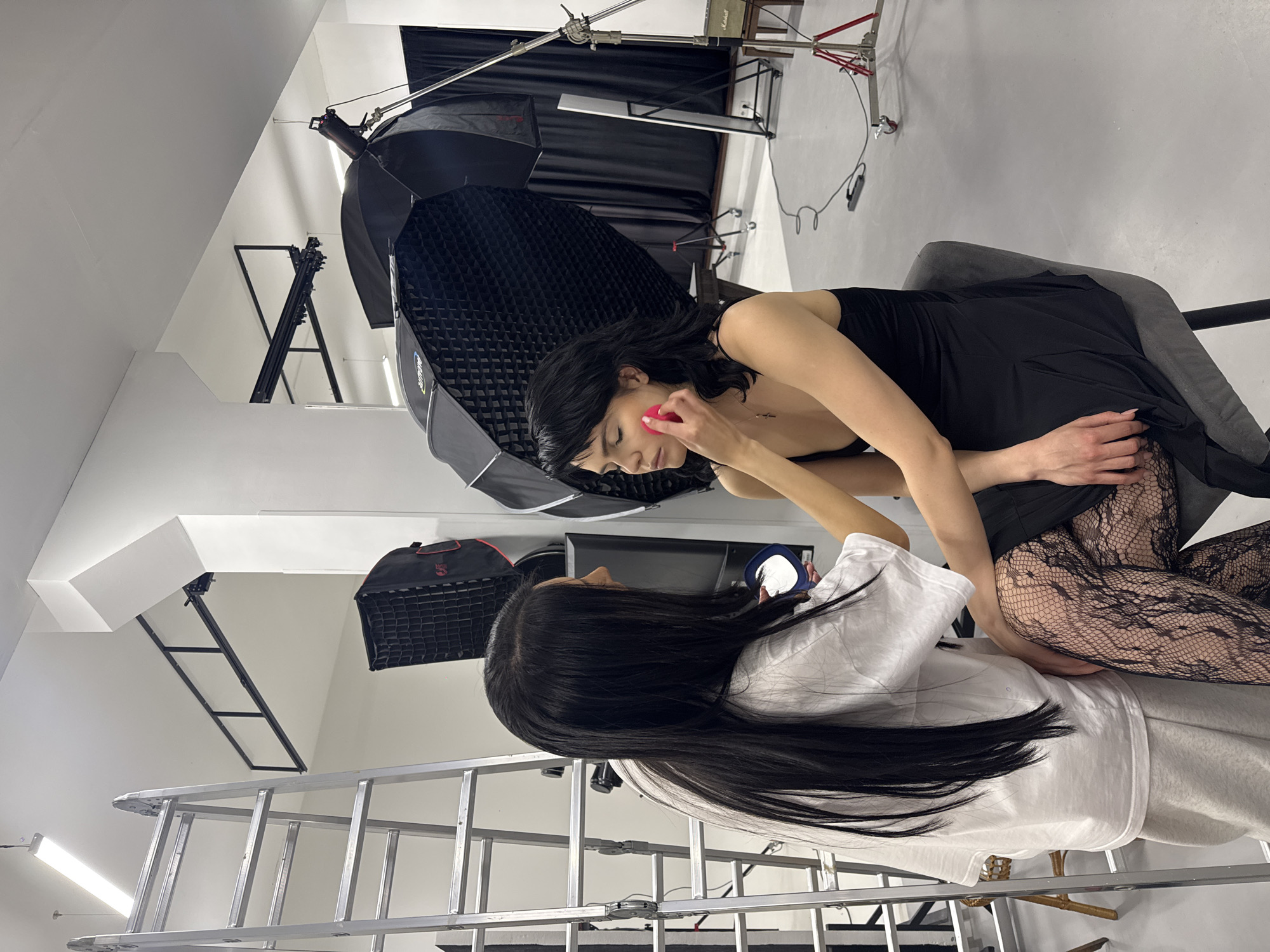 **Scene:** Indoor photoshoot setting **Location:** Likely in a professional studio, possibly in Yerevan, Armenia (inferred from user's profile, not explicitly stated in the image). **People:** * Two women are present. * One woman is applying makeup to her face using a pink sponge. She is wearing a black dress and fishnet tights. * The other woman is wearing a white shirt and grey sweatpants. She has long, dark hair. **Objects:** * Makeup sponge * Black dress * Fishnet tights * White shirt * Grey sweatpants * Gray chair * Lighting equipment (softbox with grid, other lights) * Ladders * Mirror **Actions and Interactions:** * One woman is applying makeup to her face * The women are interacting with each other as part of the makeup process **Environment:** * Professional photography studio setting * White walls and floor * Various photography lighting equipment present.