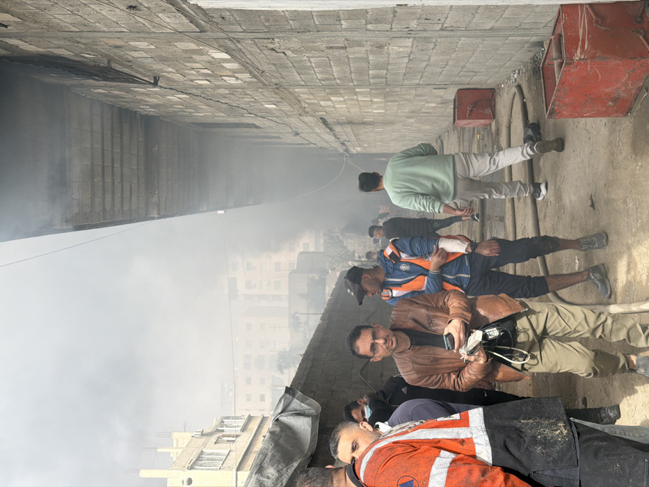 An image taken in an alleyway or narrow passage within the city of Gaza, Palestinian Territory, depicts a smoky scene with multiple individuals