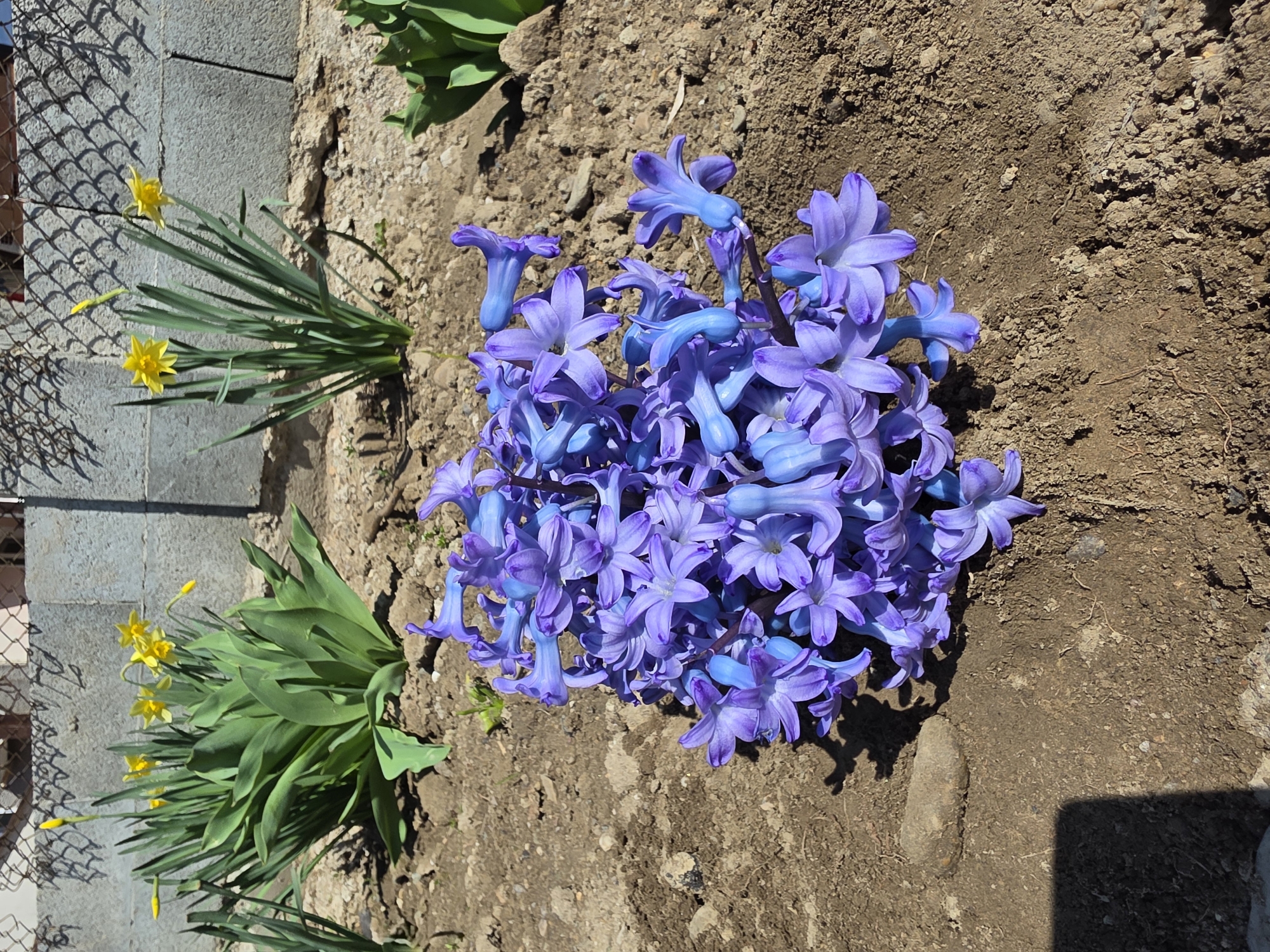 patch of soil where a cluster of purple hyacinth flowers grows, surrounded by bare earth