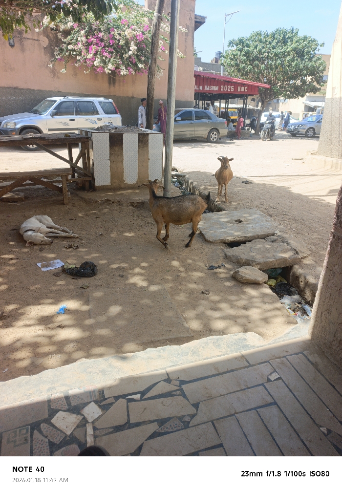 This image captures a street scene in Tudun Wazurchi, Nigeria, under direct overhead sunlight. The foreground features a partial view of a tiled step or floor, transitioning to an unpaved dirt ground exhibiting varied shades and distinct tree shadows. In the mid-ground, a white dog lies asleep on the dirt to the left. To its right, scattered litter, including a black plastic bag and a piece of paper, is visible. Two brown goats are present; one is in motion towards the right, while another stands further back. An exposed drainage ditch filled with plastic bottles and other refuse runs across the mid-ground, covered intermittently by loose concrete slabs. To the left, a rustic wooden table structure is visible, alongside a vertical block structure with white and grey tiling. The background reveals a multi-story building with a light-colored facade, from which a large bush with vibrant pink and white flowers protrudes. Parked vehicles include a silver SUV (resembling a Honda CR-V) and a grey sedan. Several individuals are standing or walking in the vicinity of the vehicles and further down the street; some wear long, light-colored traditional garments. A prominent red-roofed structure with text "ALIM HASRAM 2025 KMC" is visible on the right, suggesting a commercial establishment. Further in the distance, more vehicles, additional buildings, and a large green tree are present under a clear blue sky. Utility poles and lines traverse the upper mid-ground. The overall environment suggests an active urban or semi-urban street.