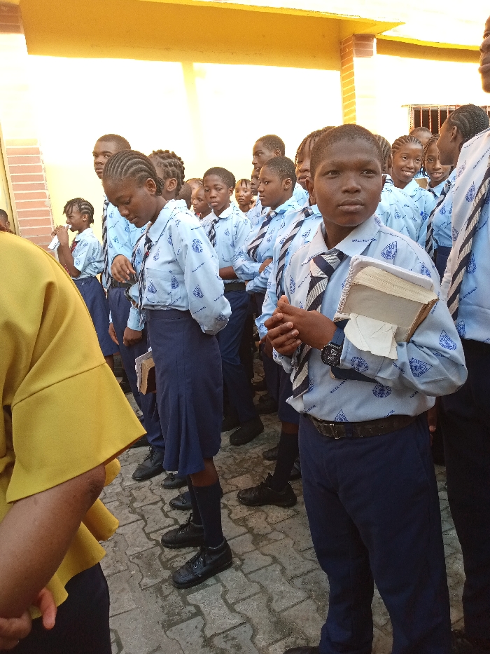A group of school children are dressed in blue and white uniforms. The children wear ties and carry books. The group stands on a paved area, and the background includes a building with yellow features. A person in a yellow shirt is in the left foreground. The children appear to be diverse.