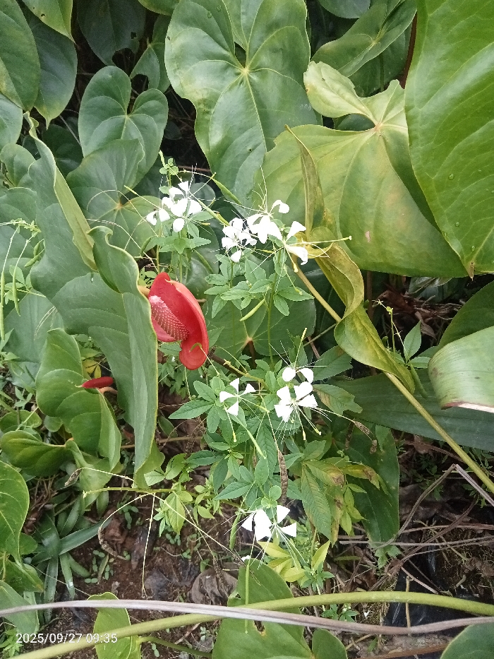 The image displays a close-up of dense vegetation in the city of Unknown, Kenya, recorded on 2025/09/27 at 09:35. Multiple large, dark green, heart-shaped leaves, consistent with Anthurium plants, occupy the upper and left portions of the frame. A single, vibrant red Anthurium spathe with a textured, reddish spadix is positioned on the left side, slightly above the image center. Below and to the right of the Anthurium, several clusters of white flowers, characterized by four distinct petals and numerous long, thin white stamens, are visible amidst smaller green foliage, consistent with Cleome 'Spider Flower' species. The ground, visible in the lower half, consists of dark soil and organic debris, with a partial black plastic container observed in the lower right quadrant. The scene is static, depicting only flora.