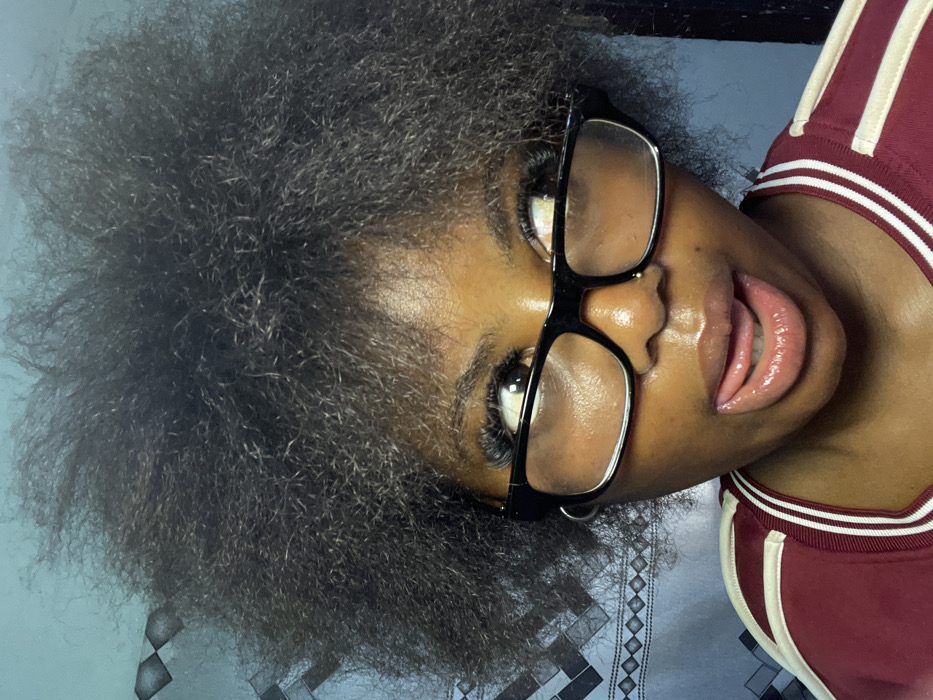 A woman faces the camera with a tilted head. She wears black-framed glasses and has full, glossy lips slightly parted. Her hair is a dark, voluminous afro texture. The woman wears a maroon top with white stripes on the shoulders. The background is a light blue color and has black and white diamond and patterned design.