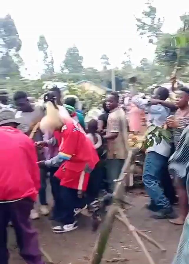 crowd of people gathered outdoors, seemingly celebrating. There are various individuals wearing different colored clothing. One person stands out, dressed in a red jacket and sporting a distinctive white headdress. Some people are holding branches or sticks. The ground is muddy, and there are trees in the background, suggesting a semi-rural environment. The camera angle is positioned within the crowd, moving slightly to capture the scene.
