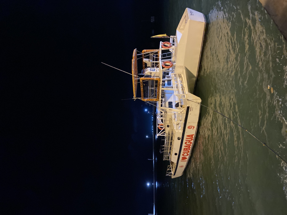 A white boat labeled "Taurus" and "I love Cubagua" is docked at night