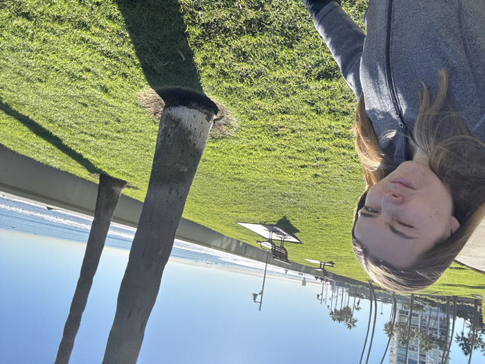 A sideways shot depicts a woman in a grey jacket. She faces the camera with one eye closed. Behind her, a lush green lawn stretches towards a beach and the ocean. Palm trees line the horizon. The sunlight casts shadows from the trees onto the grass. Benches are scattered across the lawn. Buildings rise up in the background, blending with the palm trees.