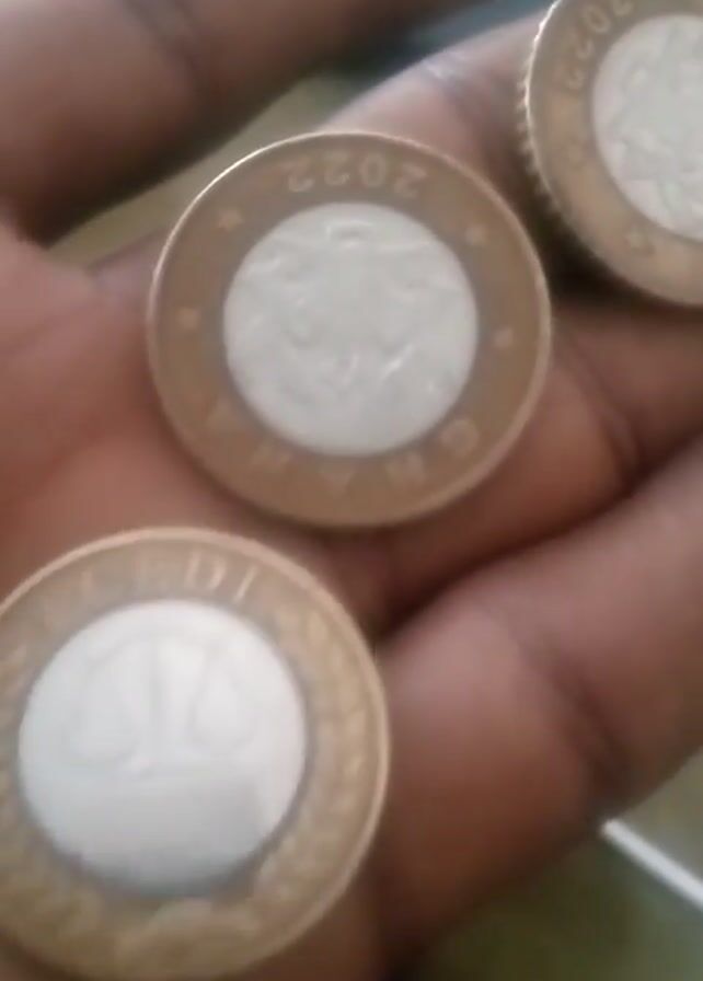 A hand holds three coins. The coins are circular with a gold-colored outer ring and a silver-colored center. One coin reads "CEDI" around the outer ring and has an image of scales in the center. Two other coins read "GHANA 2022" and have a bird-like emblem in the center. The coins are slightly blurred as the hand moves.