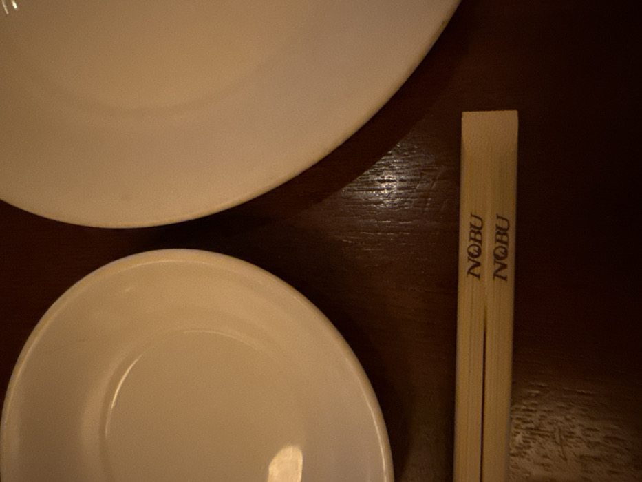 Two white plates sit on a dark brown surface. The larger plate is partially visible at the top left of the frame, with a smaller plate below it. To the right of the plates, a pair of wooden chopsticks rest side by side. The word "NOBU" is printed vertically twice on the chopsticks. The scene is dimly lit, creating soft shadows and highlights.
