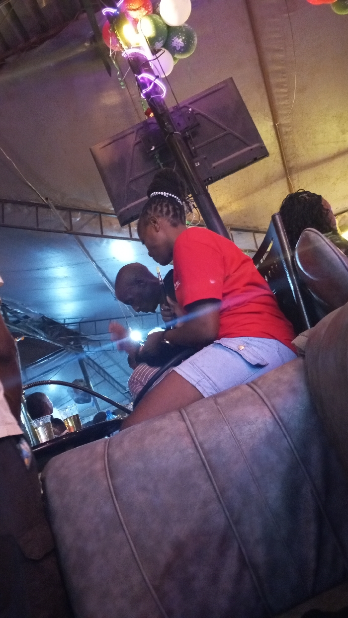 In a low-lit indoor space, a woman in a red shirt and blue shorts sits on a grey upholstered seat. A man in a striped shirt sits beside her, both looking downward. A dimly lit table is visible to their left, with glasses and a partial view of another person. Above them, balloons and string lights decorate a pole supporting a flat screen TV. Another person is partially visible behind the woman on the right. The setting appears to be a bar or event space.