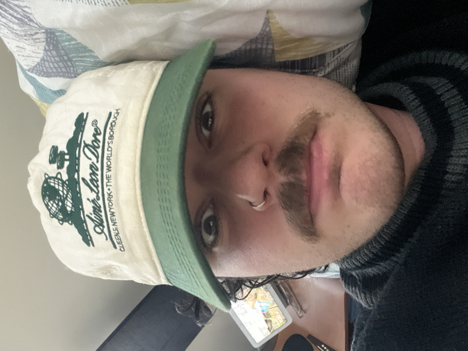 A close-up, head-and-shoulders portrait of an individual is depicted in an indoor setting in Unknown, Unknown. The subject is a light-skinned male with dark, curly hair, a prominent mustache, and a silver ring piercing in his left nostril. He wears a cream-colored baseball cap with a green brim and a green embroidered logo reading "Aimé Leon Dore Queens New York THE WORLD'S BOROUGH". His eyes are wide open, directed towards the viewer, with a neutral expression. He is dressed in a dark, ribbed turtleneck sweater. In the blurred background on the left, a dark object is partially visible, along with a digital display device on a wooden surface showing a light-colored screen, and a portion of a stringed musical instrument. On the right, a multi-colored patterned fabric, possibly a pillow or blanket with light blue, yellow, and white stripes, is visible. The lighting is even, suggesting an interior ambient source.