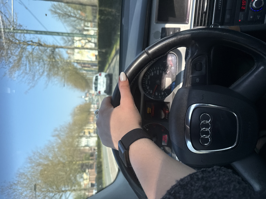 The image presents a forward-facing view from the driver's seat of an Audi vehicle on a clear, sunny day in Roubaix, France. The driver's left hand, adorned with light-colored manicured fingernails and a ring on the fourth finger, rests on the upper portion of the black, leather-wrapped steering wheel, which features the silver Audi four-ring emblem. A black smart band or fitness tracker is visible on the driver's left wrist. The vehicle's instrument panel is partially visible through the steering wheel; a speedometer indicates a speed of approximately 60 km/h. An amber warning light, possibly related to "BREMS LICHT," is illuminated on the dashboard. A digital display shows the time as 19:50. To the right of the steering wheel, a portion of the infotainment screen and the climate control unit are visible, with the temperature set to 21.5 degrees Celsius and "AUTO" mode engaged. Ahead, a white sedan or hatchback is observed traveling in the same direction on a paved road. The road is lined on both sides by bare deciduous trees and trimmed hedges, suggesting a late winter or early spring environmental setting. Buildings characteristic of an urban or suburban environment are present along both sides of the street in the middle ground. A distinct steeple or spire is visible on the distant horizon, slightly right of the road's center. The sky is clear blue, indicating bright daylight conditions.