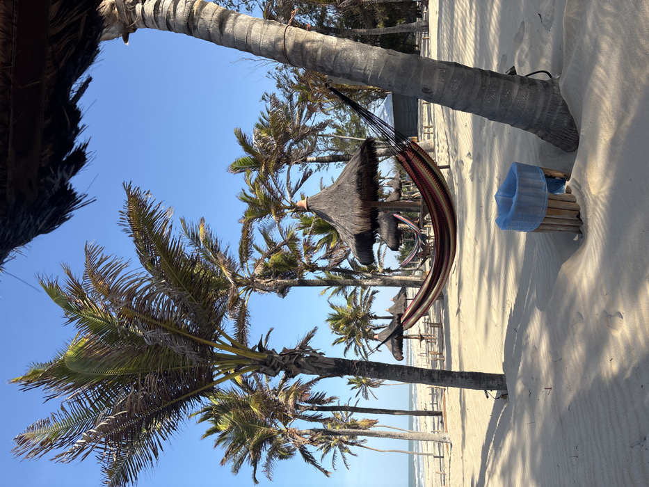 The image displays a sunny beach scene in Caucaia, Brazil, characterized by light-colored sand and a clear blue sky. Numerous palm trees with tall trunks and fronds, ranging from green to brown, are distributed across the landscape. In the foreground, a cylindrical trash receptacle with vertical wooden slats and a blue plastic liner is positioned on the sand, partially covered by sand ripples. Directly behind it and to the right, a thick palm tree trunk runs diagonally upwards out of frame. The midground features multiple thatched umbrellas providing shade, with one prominent structure slightly left of center. Several hammocks are strung between palm trees and wooden posts; a multi-colored striped hammock (red, orange, yellow, green, black) is prominently displayed, stretching from a palm tree in the mid-right to a post near a thatched umbrella in the mid-left. Additional hammocks are partially visible further in the background. Shadows from trees and an unseen overhead structure are cast upon the sand. In the background, the ocean with a visible horizon line is present. A rudimentary wooden fence or barrier parallels the shoreline in the far background, alongside what appears to be a white building or tent partially obscured by vegetation. No individuals are visible in the scene.