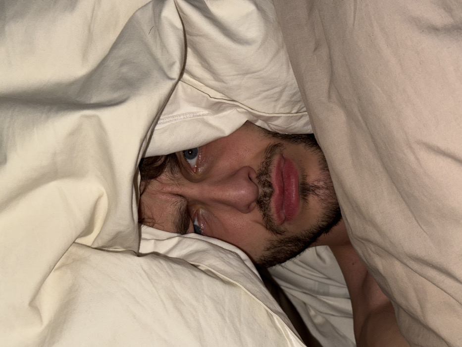 - "The scene shows a close-up portrait of a male subject, partially emerging from under light-colored, cream or beige bedding" by FM-P9stI3, licensed under CC BY 4.0
