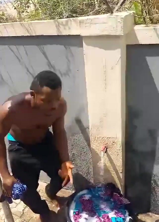 . The video shows a shirtless man squatting while washing clothes in a black washbasin outside. He is wearing black pants and light blue underwear is visible. The water comes from a tap mounted on a wall behind him. He is holding a blue and white cloth in one hand, and seems to be talking to the camera and making silly faces. The clothes in the washbasin are colorful. Next to the washbasin is another black bucket. The ground is paved with light-colored bricks. In the background, there's a wall topped with barbed wire, and some greenery behind the wall. The video is taken in daylight, and the environment appears to be a backyard or outdoor utility area.