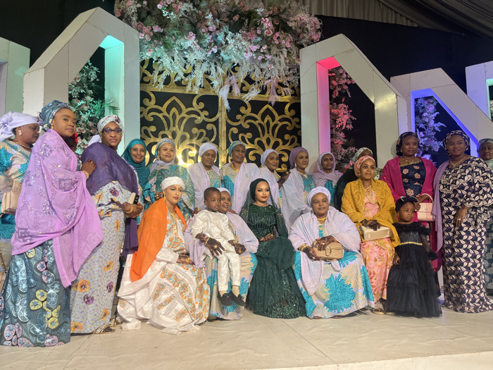 A large group of colorfully dressed women and two children pose for a photo. The women wear traditional garments and head coverings. Some women are seated while others stand behind. One child sits in a woman’s lap, and another girl stands to the side. They are positioned in front of an elaborate decorative backdrop featuring floral arrangements and white and gold design elements. The setting appears to be a formal event or celebration.