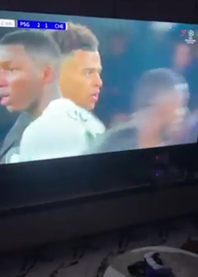 television screen displaying a soccer game. The score is PSG 2, CHE 1. The video zooms in on two players in close proximity and a potential dispute, then zooms out to show the entire field, with players in green and white uniforms. The environment surrounding the television is a domestic setting with a marbled coffee table. There are remote controls, a water bottle and other items on the table.