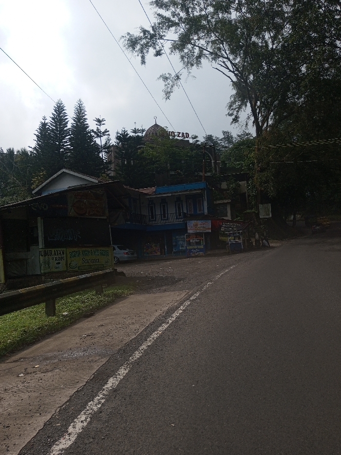 The image presents a street view in Sandamal Eliya, Sri Lanka, under an overcast sky. In the foreground, an asphalt road curves gently to the right and ascends, marked by a white solid line along its left edge. A concrete shoulder and a grey metal guardrail delineate the road from a grassy bank on the immediate left. On the left side of the road, a series of structures are visible. The closest is a single-story building featuring a dark corrugated roof, with signs in Indonesian language displaying "BUBUR AYAM & KOPI" and "Sarasa." Adjacent to this is a two-story building with a light blue and white facade, characterized by a balcony on its upper level. Several commercial signs, including "Warung," are affixed to its exterior. A light-colored sedan is parked between these two buildings. Further back and uphill, partially obscured by dense vegetation including tall coniferous trees, stands a larger building featuring a domed roof topped with a crescent moon symbol. Part of a sign displaying "ZAD" is visible on this building. The background is dominated by a lush, dark green canopy of trees, which extends along the right side of the road. No individuals are present in the scene. The sky above is uniformly grey and cloudy.