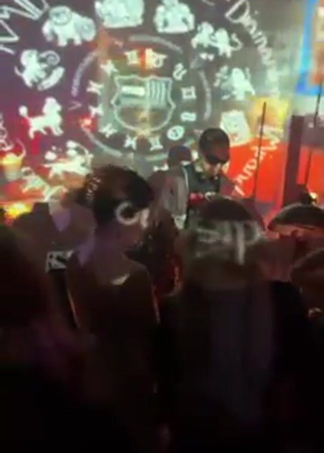 A group of people stand in a dimly lit room, watching a man in the center of the frame. He wears dark sunglasses and a black tank top with words written on it. Behind him, a projector displays a colorful design with words and symbols, including zodiac signs, a shield, and the words "TOTAL GALACTIC." The crowd is silhouetted and partially obscured. A person with blue hair stands in the front row. The scene appears to be a performance or gathering in an indoor space. The lighting is low, with some colorful lights illuminating the scene.