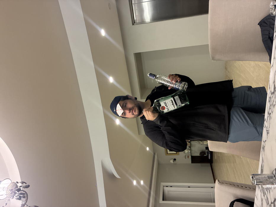 The scene depicts an interior residential setting in Huixquilucan de Degollado, Mexico. A single adult male is positioned centrally, facing forward towards the camera. He wears a dark baseball cap, a dark zippered jacket over a dark shirt, and blue/grey shorts. A white playing card, specifically the Ace of Hearts, is affixed to his forehead. He holds a green glass bottle labeled "BACARDI CARTA BLANCA" in his left hand and a clear glass bottle containing a transparent liquid, likely a spirit, in his right hand. The background features a light-colored, polished floor and light-colored walls. The ceiling is multi-tiered and white, illuminated by several recessed spotlights and a decorative crystal chandelier. To the left, a light-colored doorway with a dark door is visible. Further left in the background, a dark wooden console table displays a light-colored bust, a glass candy dish, and a framed picture on the wall above it. To the right, a large metallic panel, consistent with an elevator door, is present. In the foreground, a marble-patterned table with two light-colored upholstered chairs is partially visible, featuring a silver beverage can and a dark metallic object on its surface.