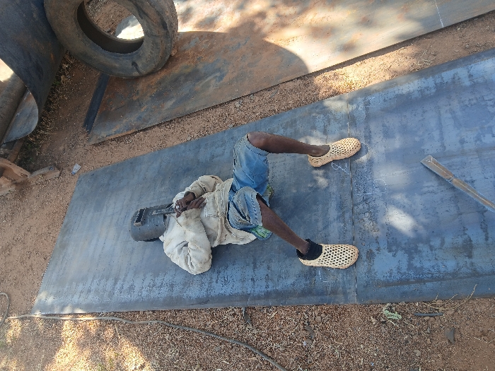 An overhead image in Unguwar Saya, Nigeria, shows a single individual lying supine on a large, dark metal sheet. The person wears a light-colored long-sleeved shirt, blue shorts, dark socks, and light-colored woven clogs. A dark welding mask covers their face, and gloved hands are clasped over a welding torch positioned on their chest. The metal sheet displays chalk markings and areas of rust. To the right of the primary sheet, additional rusted metal plates and a discarded black tire are visible. The surrounding ground is reddish-brown and appears dusty. Welding equipment cables extend out of the frame from the upper left. A metallic bar rests on the metal sheet near the individual's feet.
