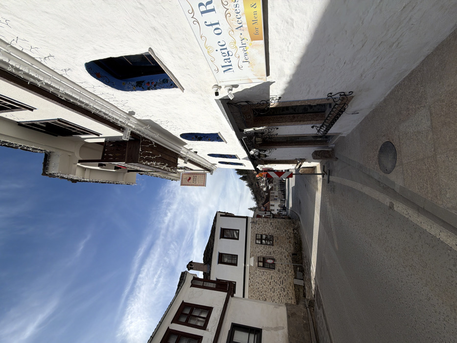 The image displays a street scene in Shiroka Laka, Bulgaria, captured on a clear day with sparse cirrus clouds in a blue sky