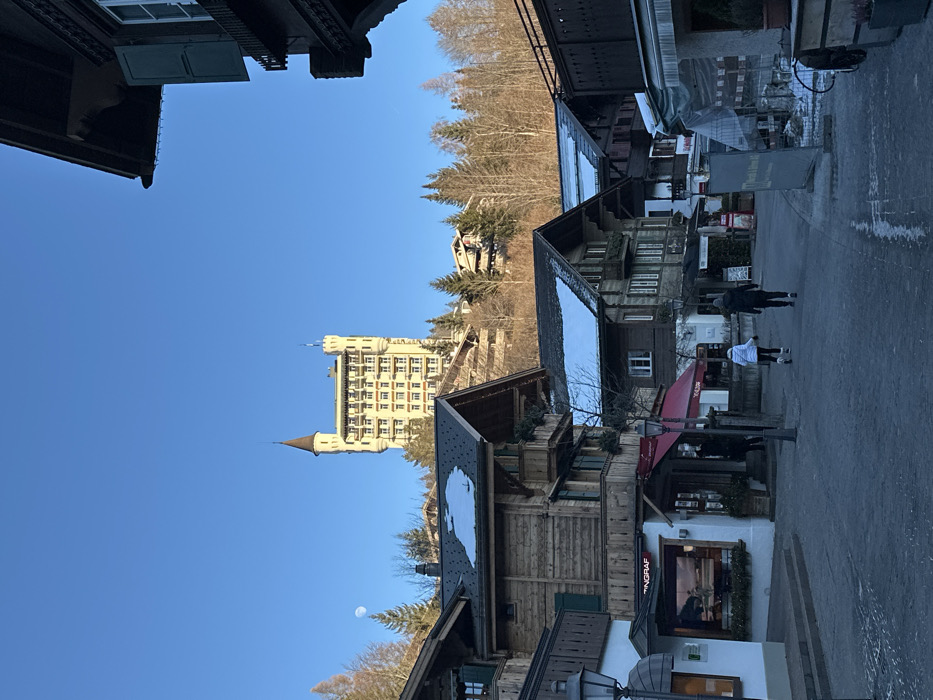 The image depicts a street view in Gstaad, Switzerland, looking uphill towards the Gstaad Palace Hotel under a clear, bright blue sky