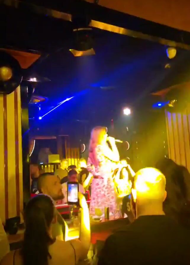 A medium shot shows a singer performing on a bar-like stage in front of a crowd of people. The singer, with blonde hair and wearing a white outfit with a floral pattern, holds a microphone and appears to be singing. She stands behind a bar. The crowd, comprising both men and women, stands in front of the stage, some holding up their phones to record the performance. The lighting is dynamic, with colors shifting from pink and white to blue and green. The background is dark, with various lights and architectural elements visible. The room appears to be a nightclub or bar with a lively atmosphere.