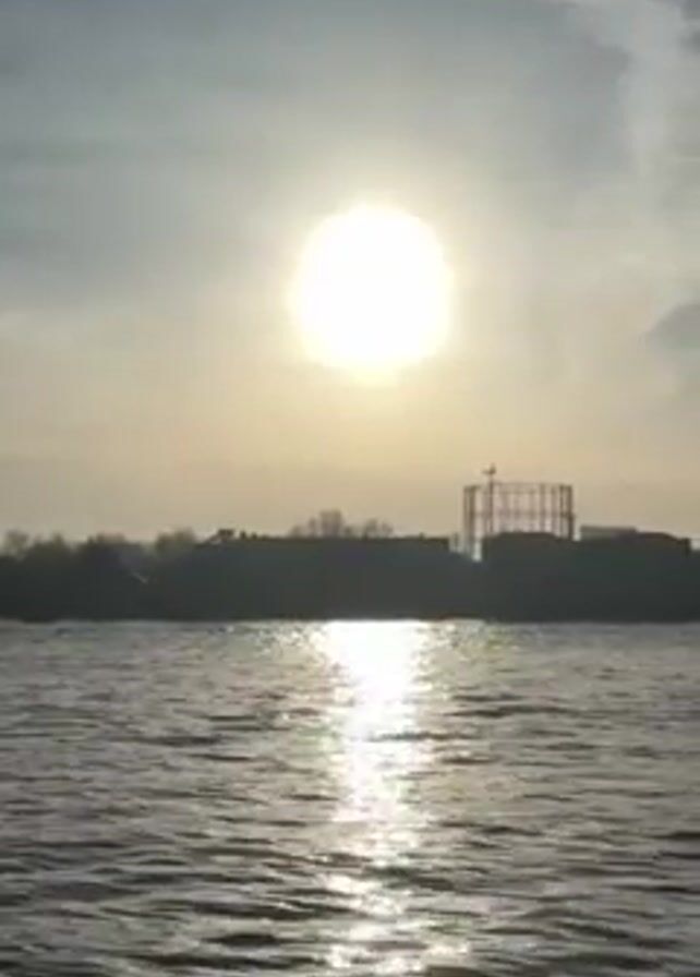 The video depicts a body of water with a reflective surface mirroring the sunlight. In the distance, the silhouette of a skyline, comprising buildings and a tall, skeletal metal structure, is visible. The sun is positioned high in the sky, casting a bright glare and partially obscured by thin clouds.