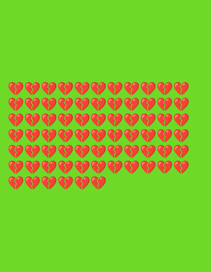 green background with 47 red broken heart emojis arranged in rows