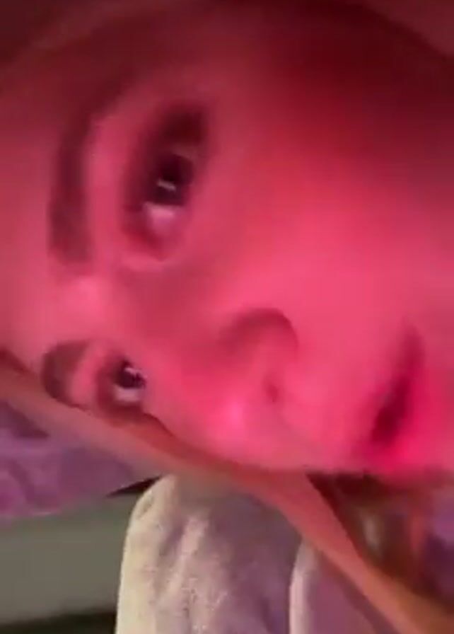 A close-up video features a fair-skinned person with reddish-brown hair wearing a light gray hooded sweatshirt. The video is shot at an angle looking up at the person. The lighting is dim and gives the person a pinkish hue. The person makes a series of silly faces, including sticking their tongue out and making angry eyes. They also place a hand with manicured nails on their cheek. They speak Spanish, stating that the Bad Bunny show was epic.