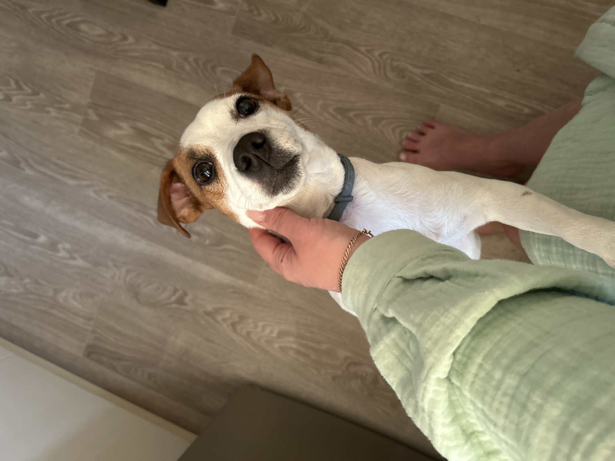 An indoor scene in the city of Chaikovsky, Russia, depicts a partial view of a person interacting with a small dog. The dog, predominantly white with brown markings on its head and ears, wears a light blue collar and looks upwards towards the camera with a slight head tilt. A human hand, adorned with a gold-colored chain bracelet on the wrist and encased in a light green, textured fabric sleeve, gently strokes the dog's chin area. The bare left foot of the person is visible on a light brown wooden laminate floor. A segment of a light-colored wall or cabinet is present on the left side of the frame.