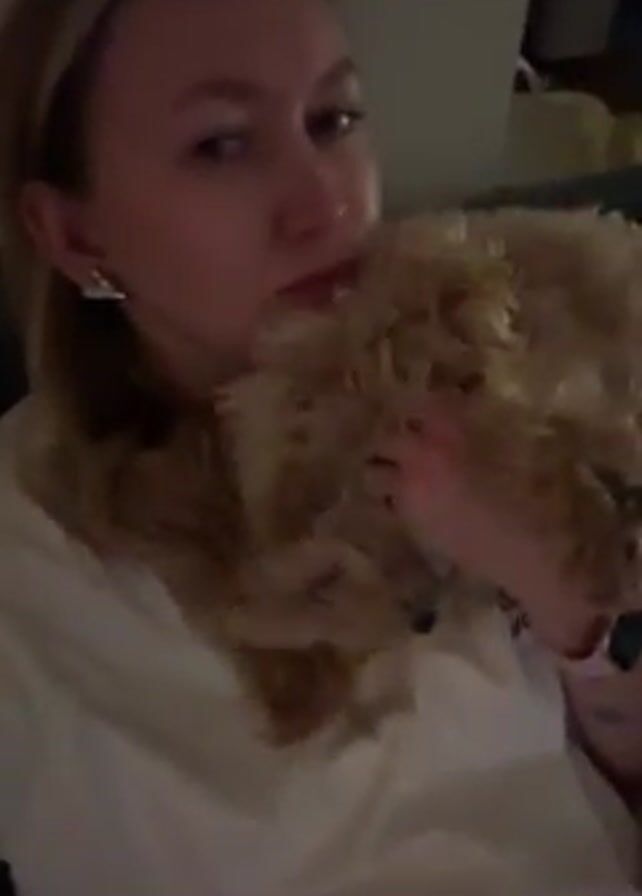 A woman with blonde hair, wearing a white shirt, holds a small, tan-colored dog in her arms