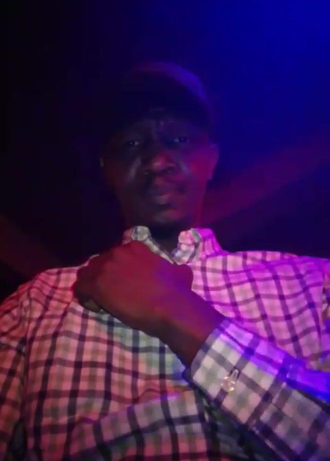 A man wearing a baseball cap and a plaid shirt is standing in a dimly lit space with blue and pink lighting. He appears to be looking at the camera. Loud music can be heard in the background.