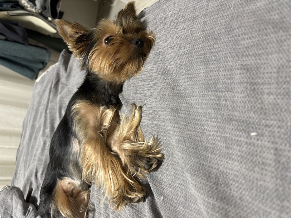 - "A Yorkshire Terrier dog is depicted lying on a grey, textured fabric surface, consistent with a bed or sofa" by FM-iZ7Ry2, licensed under CC BY 4.0