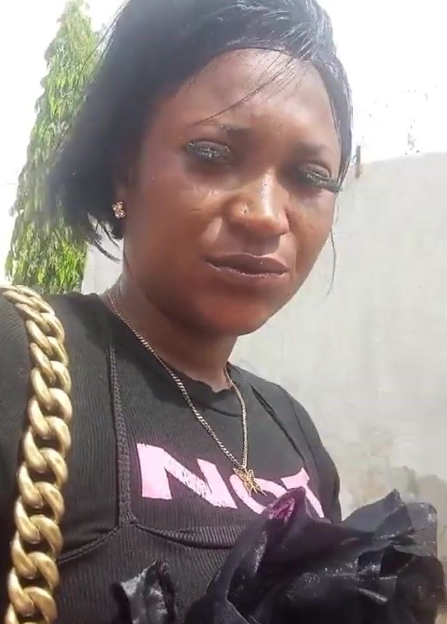 A woman is looking directly into the camera and crying. She has shoulder length dark hair and is wearing a black top with a pink design on it, a gold chain necklace, and earrings. She has a gold chain purse strap over her shoulder. She wipes her eye with her left hand. Her fingernails are painted light purple and she is wearing a gold ring with a large design on it. Behind her is a street with buildings on either side. She appears to be outdoors.