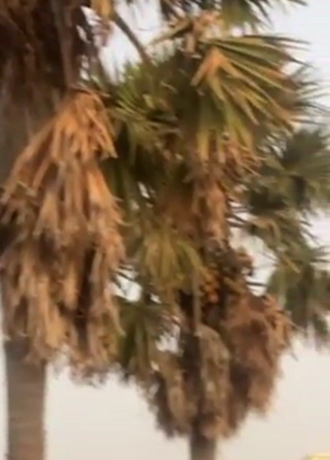 tall palm tree with a mix of green and brown fronds against a hazy sky. In the background, a yellow-roofed house with a brick exterior is partially visible. The camera pans slightly upwards, showing the full height of the tree. There are no people visible in the frame. The overall impression is one of a warm, possibly tropical or arid, environment.