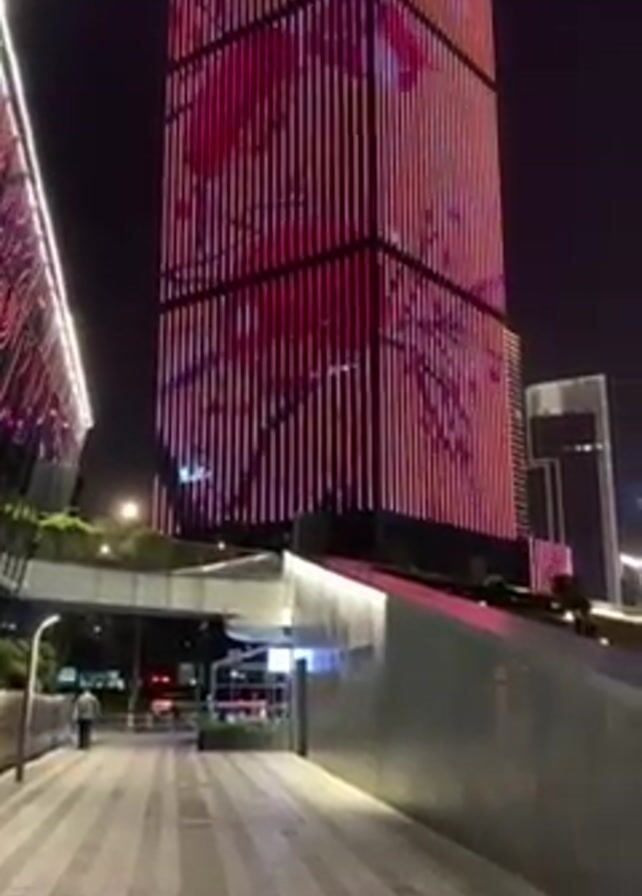 At night, a tall, thin skyscraper with vertical striped lighting dominates the scene. The lighting is primarily red and pink, forming floral or leafy patterns. The base of the building appears to have a covered walkway or plaza area, with a few people walking. There's a modern architectural design with a mix of sharp angles and greenery. The foreground shows a paved walkway or street. Other buildings are visible in the background. The lighting creates a vibrant and modern urban atmosphere.