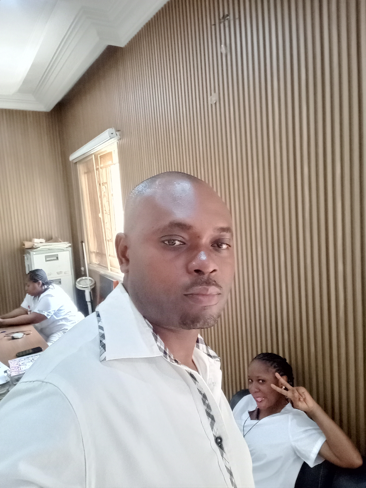 The image appears to be a selfie taken indoors, likely in an office or professional setting. The main subject is a bald man in a white shirt with a checkered collar. Behind him, another woman is sitting and making a peace sign. A third person is working at a table behind her. The background features a window and vertically striped wall. Without additional information, it's impossible to confirm the exact location in Gwarinpa, Nigeria.