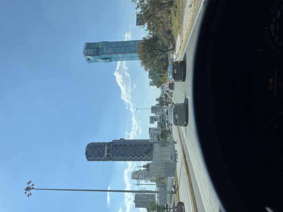 A view from inside a car shows a sunny cityscape. Two distinct skyscrapers dominate the horizon; one with a modern, glass-paneled design and another with a more textured, darker facade. A line of cars travels along a multi-lane road, with greenery and other buildings visible in the background. A lamppost stands tall on the left side of the road.