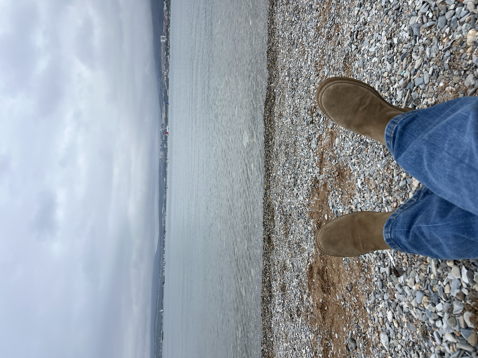 A first-person perspective photograph shows a person sitting on a pebble beach with their legs crossed. The person is wearing blue jeans and brown boots. The beach consists of small, grey pebbles mixed with sand. To the left, there is a body of water, likely a bay or sea, with a cityscape visible in the distance under an overcast sky. The scene likely depicts a seaside view in Gelendzhik, Russia.