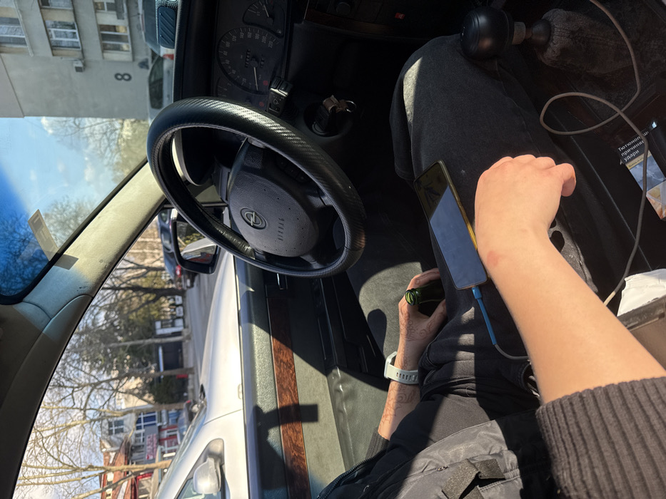 The image depicts an interior view from the front passenger seat of an Opel vehicle, looking towards the driver and an urban street scene in Yambol, Bulgaria. **Interior:** The vehicle's steering wheel, bearing the Opel logo and a black carbon fiber-style cover, is prominently visible on the right. The dashboard is dark, featuring a speedometer and tachometer cluster. Keys are in the ignition. A wooden trim panel is visible on the passenger side door. Sunlight casts strong shadows across the dark interior. A manual gear stick with a worn fabric base is located between the seats. A pack of "TREASURE" cigarettes with Cyrillic health warnings is visible on the floor next to a white paper item. **Occupants:** A person identified as the driver is seated, clad in dark clothing. Their left forearm, adorned with intricate henna or tattoo designs and wearing a light-colored smartwatch, is visible. This individual holds a green glass bottle in their lap/hand. Another person's right forearm and hand, with fair skin and wearing a dark long-sleeved garment, is visible in the foreground, holding a yellow-cased smartphone connected to a blue charging cable resting on their lap. **Exterior (Yambol, Bulgaria):** Through the windshield, a multi-lane urban street is visible. A white sedan is parked immediately to the left of the observer's vehicle. On the right side of the street, a multi-story residential building (light gray/beige) with a prominent black number "8" on its facade and an air conditioning unit is seen. Across the street, other commercial and residential buildings are present, with some showing red signage. The street is lined with bare deciduous trees, suggesting late autumn or early spring. The sky above is clear and blue. The exact street name is not discernible from visible signage.